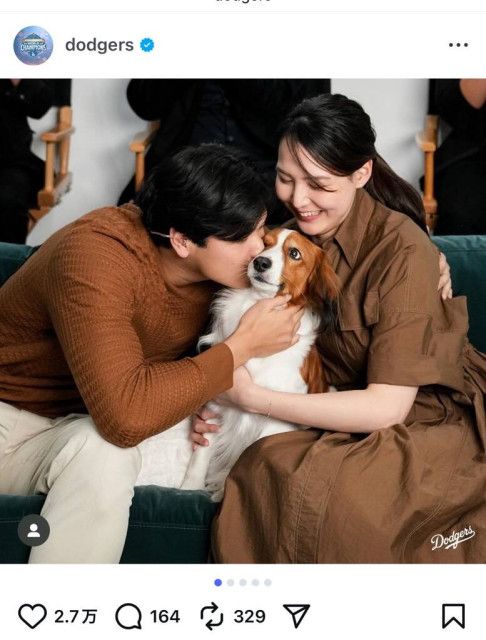 大谷はブラウンのセーター、真美子さんはブラウンのワンピース、そしてデコピンもブラウン系の毛並み。