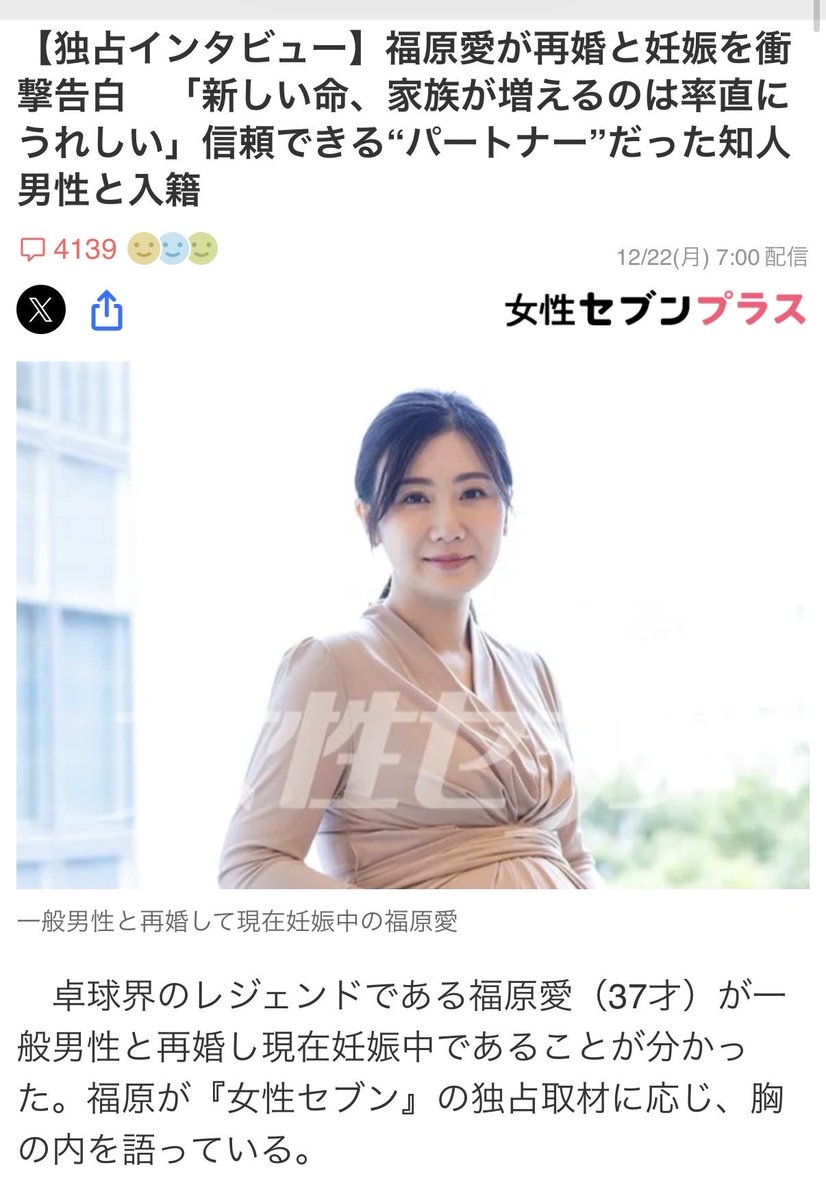 @KokuichiBunta【独占インタビュー】福原愛が再婚と妊娠を衝撃告白 「新しい命、家族が増えるのは率直にうれしい」信頼できる“パートナー”だった知人男性と入籍 (女性セブンプラス) news.yahoo.co.jp/articles/9ceed…