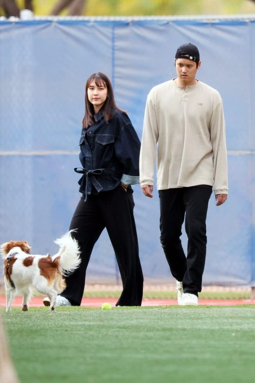 大谷さんはキャップからスニーカーまで黒で統一。真美子さんはトップス、スニーカーまで白で爽やかに。モノトーンのカップルコーデに、ドジャースブルーが差し色で入ると、視線は自然に彼女側へ。色の主役が一目でわかる、洗練されたバランス。写真映えの法則って、やっぱり“2色+1アクセント”が鉄板だよね。