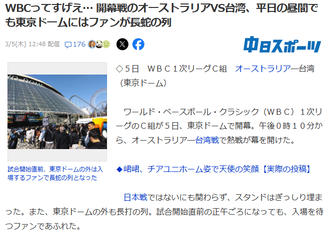 @daiki728838772WBCってすげえ… 開幕戦のオーストラリアVS台湾、平日の昼間でも東京ドームにはファンが長蛇の列(中日スポーツ) u.lin.ee/llkNQZG?mediad…